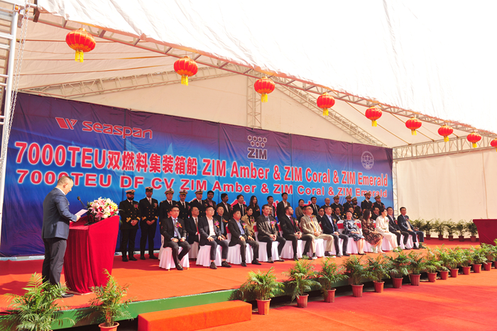 命名人Ana Ang女士、Sally Cheung女士、Cindy Li 女士,SEASPAN首席商務(wù)官李堃先生,ZIM亞洲區(qū)副總裁Metanes Abdallah先生,挪威船級(jí)社(DNV)高級(jí)副總裁黃今先生,中國船舶及海洋工程設(shè)計(jì)研究院(MARIC)副所長朱建璋先生,法國巴黎銀行出口信貸助理副總裁江琛女士,中國出口信用保險(xiǎn)公司江蘇分公司項(xiàng)目險(xiǎn)業(yè)務(wù)處副處長馬振先生,我集團(tuán)董事長任樂天先生,集團(tuán)副總經(jīng)理兼新?lián)P子造船總經(jīng)理杜成忠先生、集團(tuán)副總經(jīng)理周科偉先生,集團(tuán)總經(jīng)理助理吉宏飛先生,以及船東監(jiān)造組、項(xiàng)目合作相關(guān)方等領(lǐng)導(dǎo)和嘉賓出席了儀式。