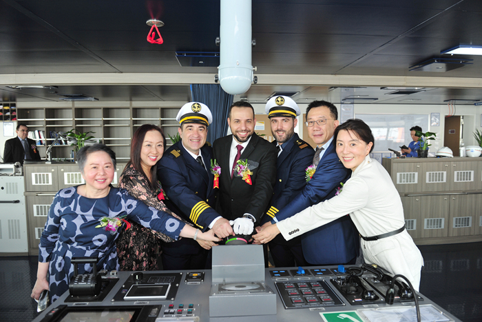 Cindy Li 女士將N1371船命名為“ZIM EMERALD”輪。嘉賓們共同與新船合影留念,祝福新船在未來的每一次航程中,順風(fēng)順?biāo)?,為船員帶來平安,為船東和合作各方帶來財(cái)富和榮耀。