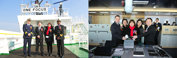 岳娟女士將新船命名為“ONE FOCUS”輪,為新船砍纜并擲香檳禮,拉響汽笛,祝福新船、隨船船員航行平安,為船東和租家?guī)順s譽和財富。
