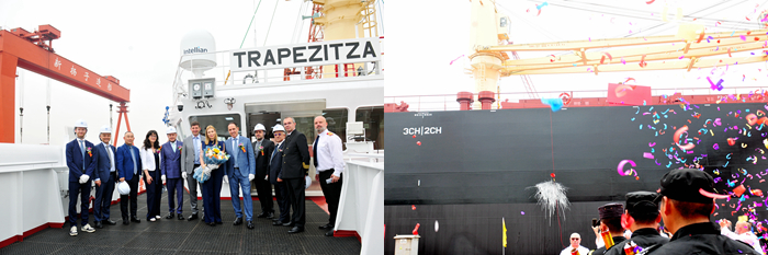Dani Domuschieva女士將新船命名為“TRAPEZITZA”輪,并擲香檳禮。鞭炮、禮花齊響,汽笛共鳴,龍獅共舞。祝福新船、隨船船員航行平安,為建造方帶來榮譽(yù),為船東帶來好運(yùn)與財富。嘉賓們齊聚船艏合影留念,并在船長的陪同下登船參觀。