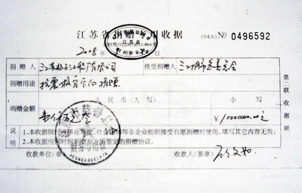 2008年5月,集團(tuán)公司向四川汶川災(zāi)區(qū)捐建學(xué)校計(jì)1000萬元,集團(tuán)員工向四川災(zāi)區(qū)捐款30萬元人民幣。(附1000萬捐款憑證及員工捐款30萬憑證)